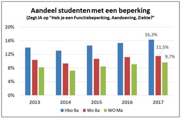 Deze groepen studenten dringen kennelijk minder tot de masteropleidingen door. In bachelorfase heeft 16,3 procent (hbo) en 11,5 procent (wo) een beperking. In wo-masteropleidingen is dat slechts 7,9 procent.