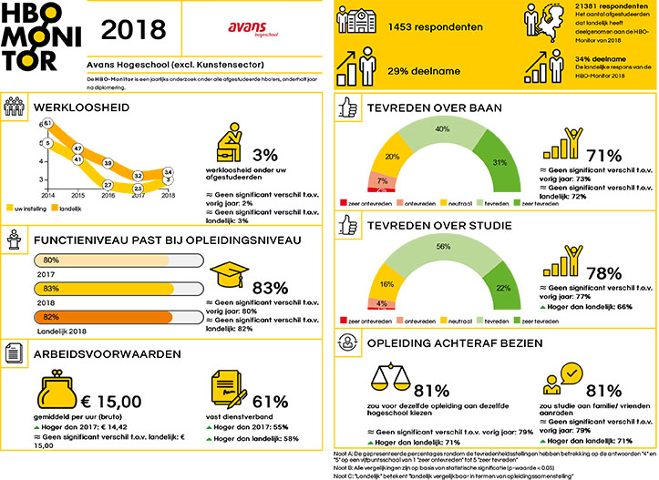 Voor de HBO-Monitor 2018 zijn ruim 21.381 hbo’ers ondervraagd, waarvan 1.453 Avansstudenten die in het studiejaar 2016-2017 zijn afgestudeerd. De Akademie voor Kunst en Vormgeving St. Joost doet niet mee aan het onderzoek, maar wel aan de Kunsten Monitor. Op bijna alle punten in de HBO-monitor 2018 scoort Avans (net iets) beter dan het landelijke gemiddelde.