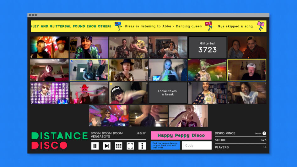 “Het is in feite een soort zoom-achtige omgeving waar je verschillende disco’s kunt bijwonen. Er zijn disco’s die wij organiseren, maar je kunt ook zelf gepersonaliseerde disco’s maken voor een eigen groep”, zegt Mark Meeuwenoord. Het is geen stream zoals we die vaker zien, maar eigenlijk een spel. “Je wordt in de disco gekoppeld aan een dansmaatje die hetzelfde nummer krijgt te horen als jij. Het is de bedoeling om erachter te komen wie die persoon is. Je ziet allemaal kleine schermpjes waar mensen dansen, dus je moet het aan de dansmoves kunnen zien.”