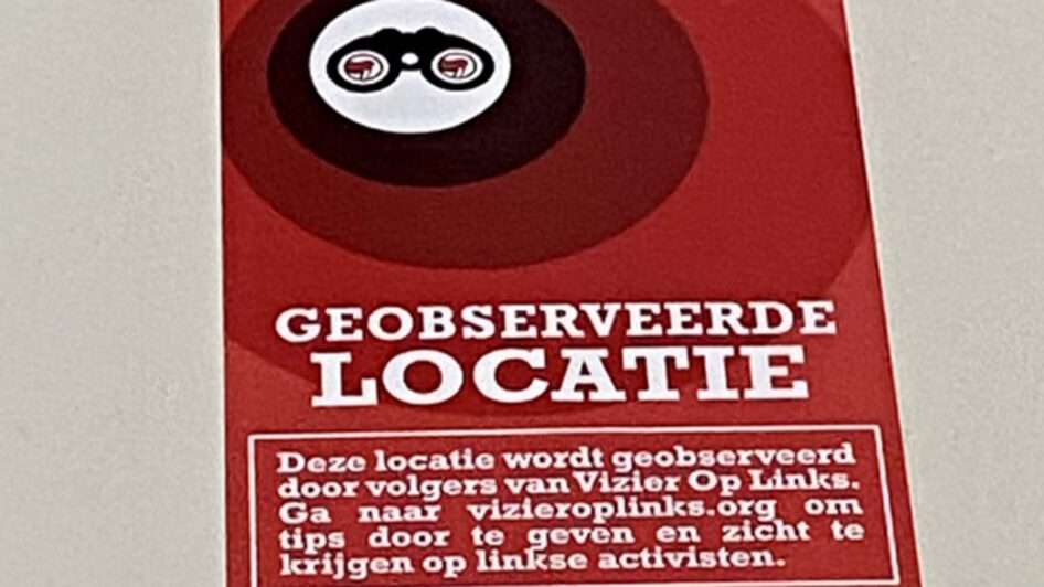 “Deze locatie wordt geobserveerd door volgers van VizierOpLinks”, staat op de sticker. “Ik moest echt mijn best doen om niet in paniek te raken voor de kinderen”, zegt Bouras erover tegen de Volkskrant.