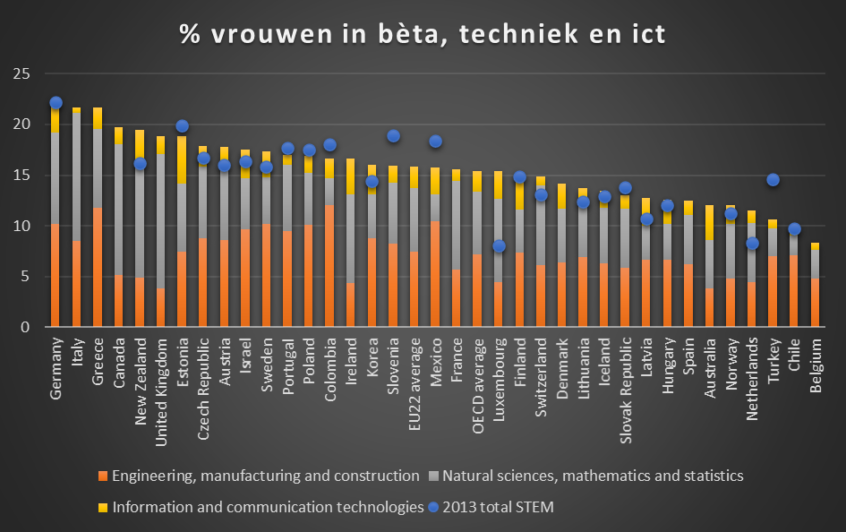 Alleen in Turkije, Chili en België kiezen minder meisjes in het hoger onderwijs voor deze vakgebieden dan hier. Overigens stond Turkije in 2013 nog ver boven Nederland op dit gebied.
