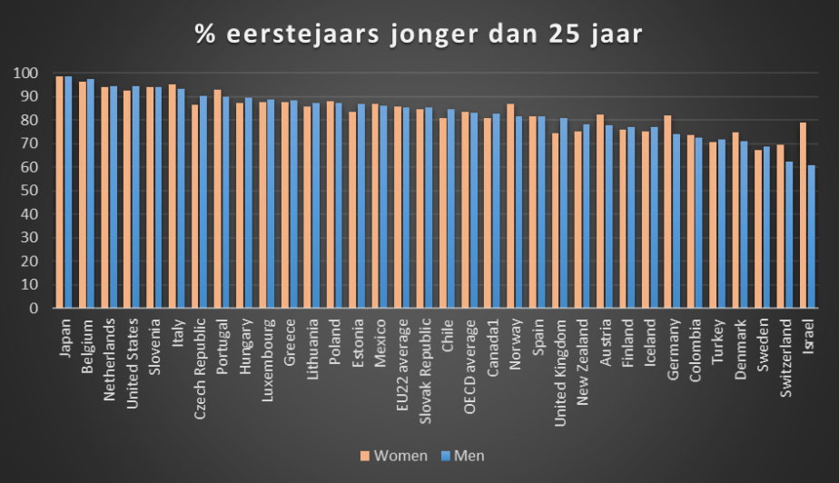 Zo zijn er tussen de OESO-landen meer verschillen die in het oog springen. In Nederland is bijvoorbeeld 94 procent van alle eerstejaarsstudenten (in het hele hoger onderwijs) jonger dan 25 jaar, zonder noemenswaardig verschil tussen mannen en vrouwen. Alleen België en Japan komen daar bovenuit. In Denemarken, Zweden en Zwitserland daarentegen ligt dat percentage onder de 75 procent. In Israël valt het grote verschil tussen mannen en vrouwen op.