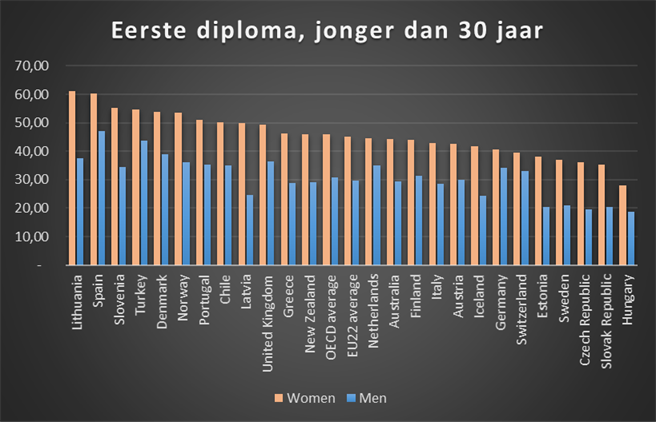 Dus is het vooral zoeken naar minder tijdgebonden informatie. Hoeveel procent van de mannen en vrouwen behaalt een eerste diploma in het hoger onderwijs vóór de leeftijd van dertig jaar? In alle landen behalen vrouwen eerder hun diploma dan mannen, maar in Nederland valt het verschil relatief mee.