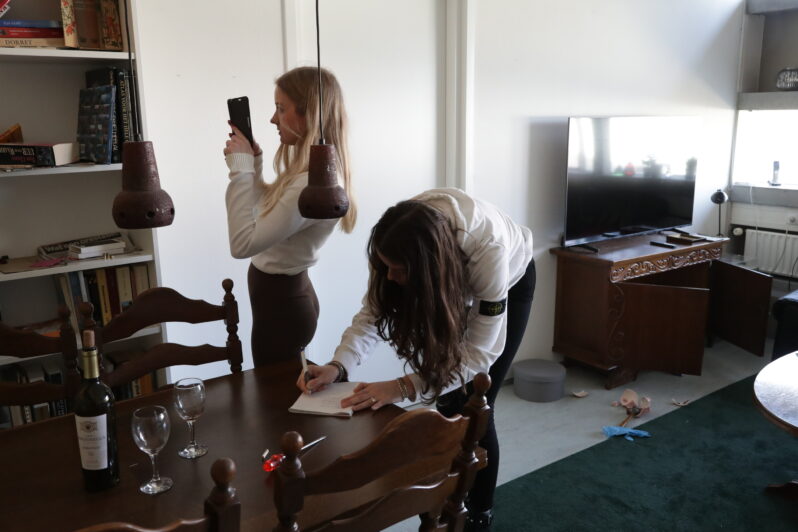 Voor het ene duo is het scenario al duidelijker dan voor de andere. Als student Aurelia langs de keuken loopt staat een ding; “Het zijn wel echt alcoholisten”, lacht ze, doelend op de flessen wijn die her en der staan. En zo scannen alle studenten hun eigen plaats delict af. Op 18 maart komen de groepen opnieuw bij elkaar en bespreken zij hun scenario. Dan horen zij of hun hypotheses kloppen.