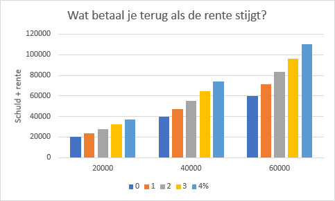 Dat ligt dus aan de rente. Bij 0 procent rente betaal je alleen maar terug wat je hebt geleend. Bij 4 procent betaal je in de loop der jaren bijna het dubbele terug. Hieronder zie je hoe dit gaat met studieschulden van 20 duizend, 40 duizend en 60 duizend euro.