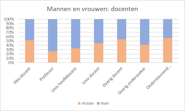 Hbo-studenten hebben meer vrouwen dan mannen als docent. De hogescholen telden 16.912 mannelijke en 18.927 vrouwelijke docenten. Aan de universiteiten verschilt het per type docent en onderzoeker.