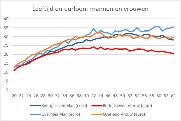 Het verschil neemt af, maar vrouwen krijgen over het algemeen minder betaald dan mannen. Dat is met name in het bedrijfsleven het geval, waar mannen zo rond hun dertigste beduidend meer beginnen te verdienen dan vrouwen. Bij de overheid hebben vrouwen aanvankelijk een voorsprong, maar die verdwijnt als ze begin veertig zijn.