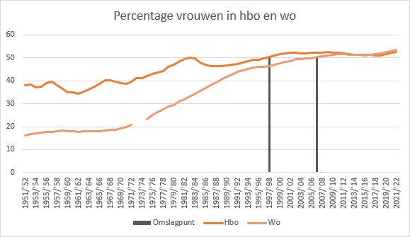 Vroeger gingen vrouwen minder vaak studeren, maar sinds 1997 staan er in het hbo meer vrouwen dan mannen ingeschreven. Negen jaar later werd het omslagpunt ook aan de universiteiten bereikt.