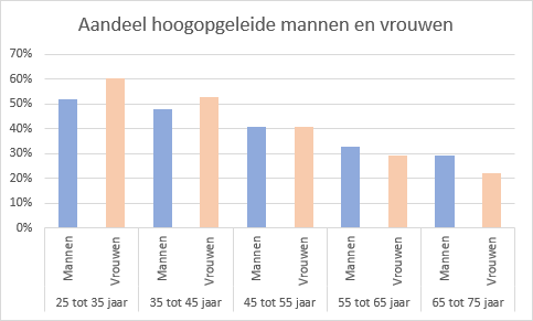 Als er meer vrouwen studeren en hun diploma behalen, zijn er uiteindelijk ook meer vrouwen dan mannen hoogopgeleid. In de leeftijd tussen de 25 en 45 jaar hebben vrouwen beduidend vaker een hbo- of wo-diploma dan mannen.