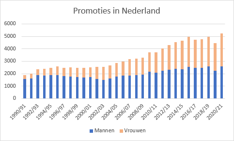 Overigens bleek in 2019 uit onderzoek van de Universiteiten van Nederland dat mannen en vrouwen ongeveer even vaak het proefschrift afronden. Dat lukt uiteindelijk zo’n driekwart van hen.