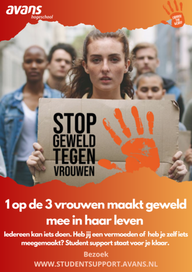 De twee Bossche eerstejaarsstudenten ontwierpen samen posters die op en rond verschillende Avanslocaties in Breda en Den Bosch hangen. Er staan cijfers op over geweld tegen vrouwen en meisjes en dat Avansstudenten en -medewerkers zich kunnen melden bij Student Support als ze zelf iets naars hebben meegemaakt. De posters zijn geïnspireerd op de ontwerpen van Orange the World, maar daar staan alleen BN’ers op met #medestander. “Het toevoegen van tekst maakt het duidelijker waar het om gaat. Dat maakt het persoonlijk en dat is precies wat we willen”, vertellen de twee.