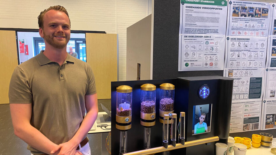 Student Bjarne Kooijmans rondde zijn project met een acht af. Zijn liefde voor Starbucks was voor hem de aanleiding van zijn project. ‘’Ik drink veel Starbucks en betaal ook voor de ervaring die ik daar krijg”, vertelt hij. Starbucks heeft niet alleen cafés, maar ook onbemande verkooppunten. Volgens de student zijn deze echter te vergelijken met het halen van een cappuchino bij de AH To Go. Uit irritatie en kritiek richting Starbucks bedacht Bjarne een nieuw onbemand verkooppunt, die wel de Starbuckservaring geeft. ‘’Mijn punt bestaat uit twee onderdelen. Een AI-aangedreven avatar en het koffieproces.’’