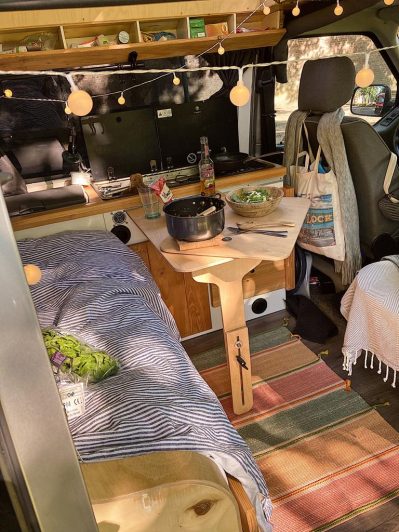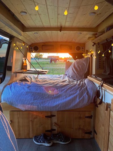 Ze kocht een tweedehands Volkswagenbus. Die veranderde dankzij haar handige vader in een paar maanden in een plek om te wonen. Er zit een bed in, een bureau dat uit de muur komt, een kledingkast, een tafeltje, een chemisch toilet, een kachel, een wasbak met daarnaast twee gaspitten, een koelbox en twee jerrycans met zeven liter stromend water. ”Ik heb alles wat ik nodig heb. Ik kan er goed werken en het bed slaapt gelukkig ook echt goed”, vertelt Nienke. ”Alleen een douche ontbreekt, maar dat kan ook op camperplaatsen, voor het coronatijdperk bij sportscholen of bij vriendinnen thuis, als ik daar op bezoek ga.”